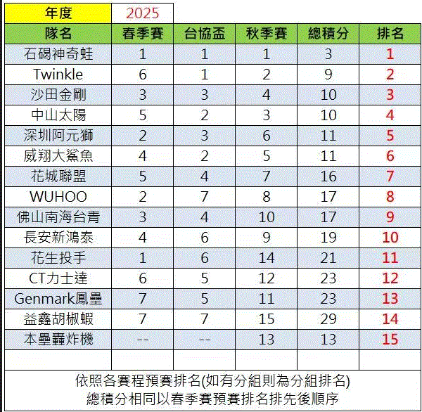 2015年春季聯賽積分表 球隊 應賽場次 已賽場 勝場 敗(負)場 和局...