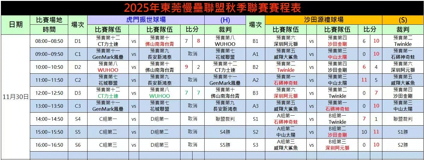 【聯盟公告】![]() ![]() 2025年東莞慢速壘球聯盟 秋季聯賽 (決賽) 比賽結果 活力組: 第1名 石碣神奇蛙 第2名 Twinkle 第3名 沙田金剛 優勝 中山太陽/阿元獅 /威翔大鯊魚 熱情組: 第1名 WUHOO 第2名 佛山南海台青 第3名 CT力士達 優勝 鳳壘/長安新鴻泰/花城聯盟 以上 特此公告 ............................................ |