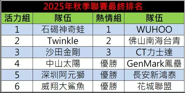 【聯盟公告】![]() ![]() 2025年東莞慢速壘球聯盟 秋季聯賽 (決賽) 比賽結果 活力組: 第1名 石碣神奇蛙 第2名 Twinkle 第3名 沙田金剛 優勝 中山太陽/阿元獅 /威翔大鯊魚 熱情組: 第1名 WUHOO 第2名 佛山南海台青 第3名 CT力士達 優勝 鳳壘/長安新鴻泰/花城聯盟 以上 特此公告 ............................................ |