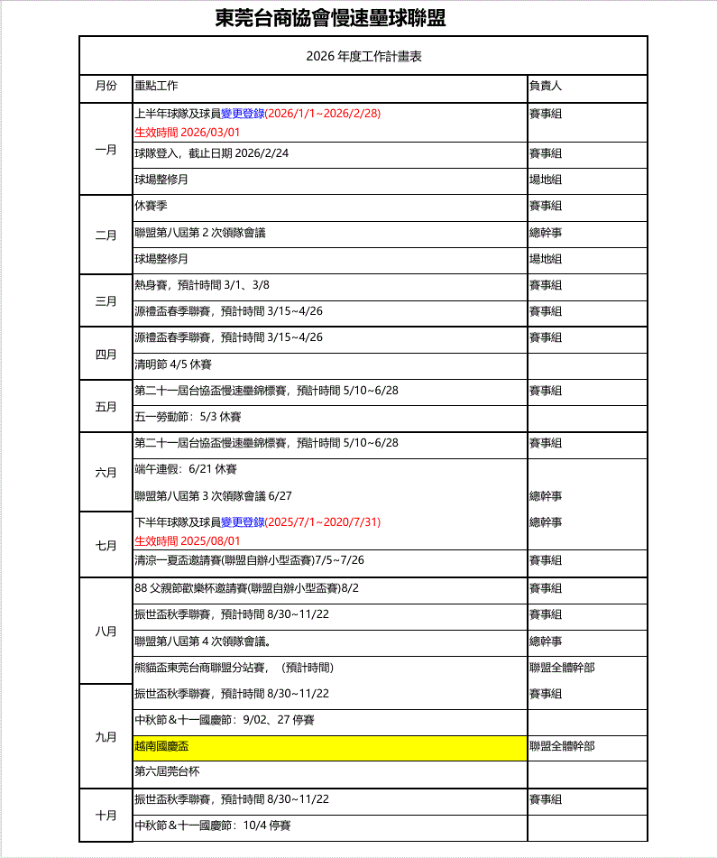 2025年東莞台商慢速壘球聯盟年度工作計畫公告